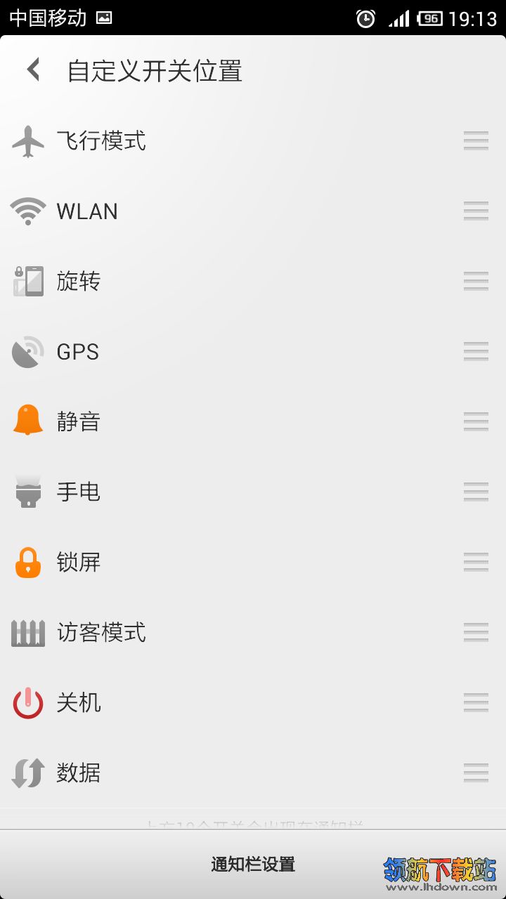下面在设置自定义状态栏通知,这是我自己设置好的,个人感觉需要的都差不多都在了。大家如果不想玩手机了,就可以把通知栏拉下来点锁屏就可以了,不仅可以省电还可以不伤关机键,如果不方便有声音的地方可以把手机设置为静音。