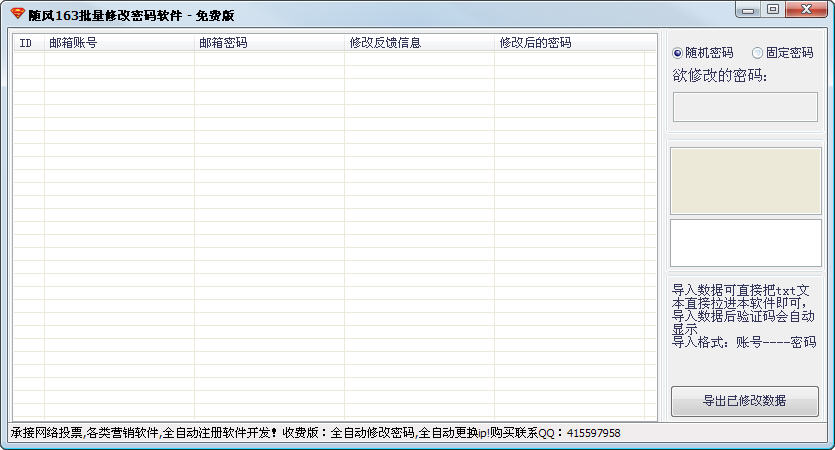 随风163批量修改密码工具功能如下: 一:支持批量导入163邮箱 二:支持全自动修改密码 三:支持自定义密码修改 四:支持随机密码修改 五:支持修改后密码批量导出