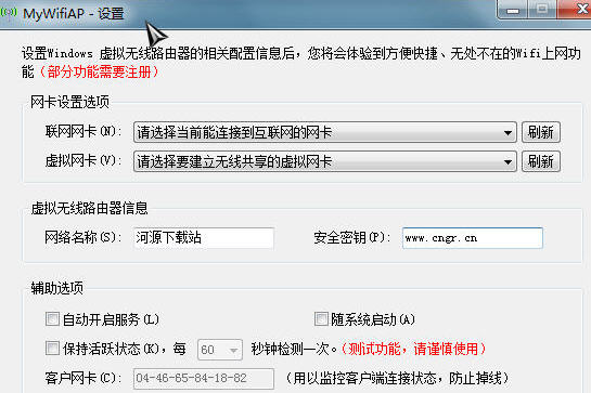 每次运行此软件后自动开启虚拟无线路由器功能。若以上几个设置项目不正确,慎用此选项
