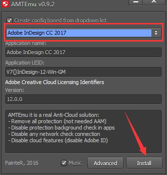 选择选择Adobe InDesign cc2017,点击install。 如图四。5第五 步:找到amtlib.dll文件