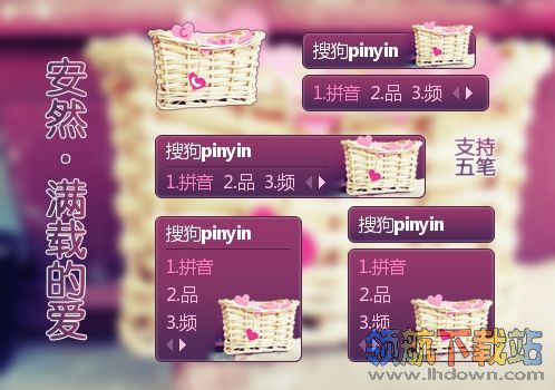安然·满载的爱(搜狗输入法皮肤) 搜狗皮肤使用说明: 如果你下载到的搜狗输入法的皮肤是一个ssf格式的文件,你双击它就可以安装上皮肤了。安装上皮肤后,在输入法的右键菜单上,有更换皮肤项,你可以点击切换皮肤。