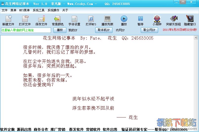 网络记事本非凡花生版简介: 采用c++6.0编译而成的新一代概念版记事本 在您工作的时候 在您休息的时候 在您写作的时候 随时写 随时保存 还可以一边写一边放音乐 结合微软记事本的综合功能,采用整体便捷的操作框架。 方便操作,及时存储,一键保存/复制/粘贴。