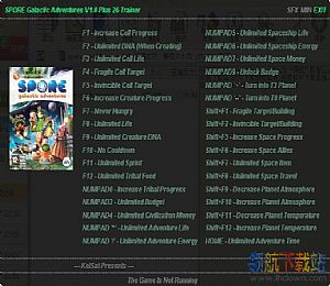 简介:孢子银河大冒险修改器_孢子银河26项属性修改器使用方法:1、打开修改器。2、打开游戏,使用热键进行修改。新版修改器界面使用方法:1、关闭打开音乐,鼠标左键点击SFX即可。(