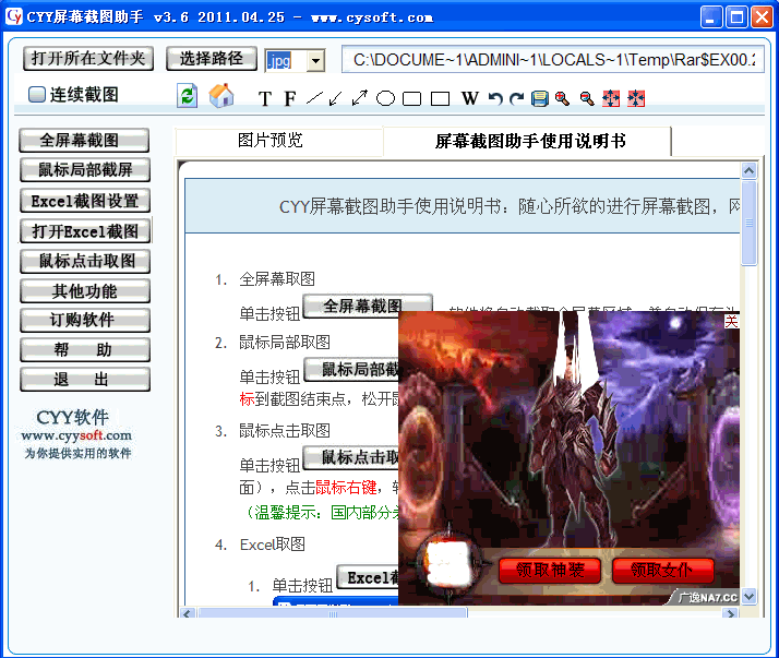CYY屏幕截图助手全面支持Windows 7 屏幕截图助手是一款屏幕截图的免费软件,主要特点:连续屏幕截图、自动保存、仿QQ截图局部截图 连续可控式截图,截图效率可提高5倍以上。 提供多种屏幕截图 功能,支持多种图片格式 可自动或手动加入水印(文字水印或图片水印) 多种图片格式转换(jpg,bmp,jpeg,ico,EMF,WMF,PNG) 截图自动保存到文件夹、自动保存在粘贴板 触发式智能提示,免除对照功能说明书的麻烦。
